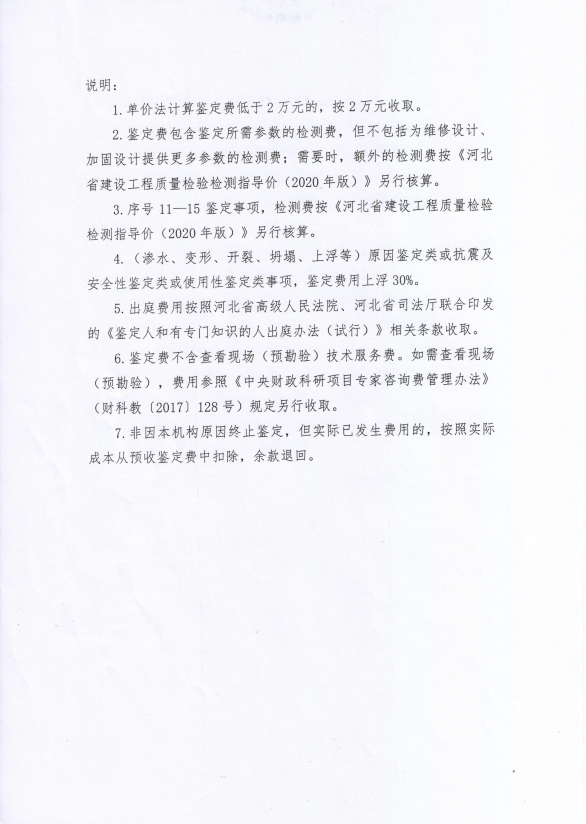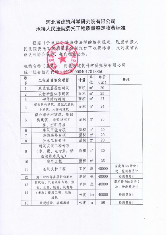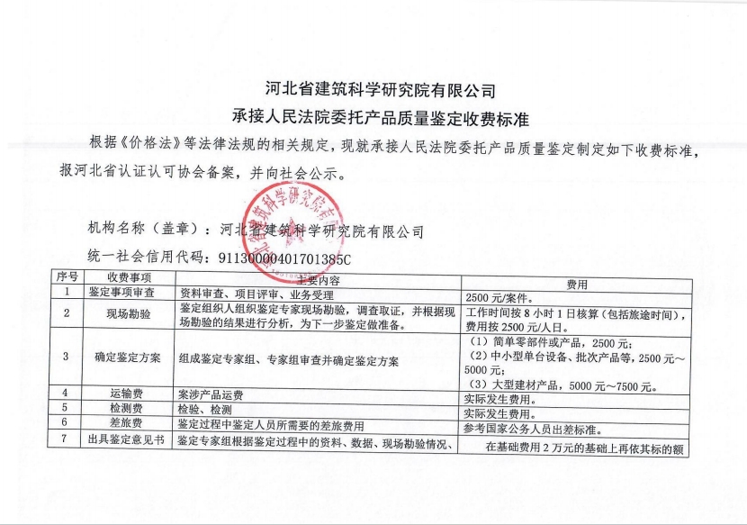 根據(jù)《河北省認證認可協(xié)會產(chǎn)品質量鑒定管理辦法(試行)》第36條、《河北省認證認可協(xié)會工程質量鑒定管理辦法(試行)》第35條“目前國家物價管理部門未對工程質量鑒定收費進行統(tǒng)一定價,鑒定機構應當公示本機構收費標準”之規(guī)定,我公司參照財政部財科教【2017】128號《中央財政科研項目專家咨詢費管理辦法》中的有關規(guī)定,并結合我公司產(chǎn)品質量鑒定和工程質量鑒定中鑒定專家工作的實際情況,制定了《河北省建筑科學研究院有限公司產(chǎn)品質量鑒定/工程質量鑒定收費標準》(見附件)?,F(xiàn)予以公示。