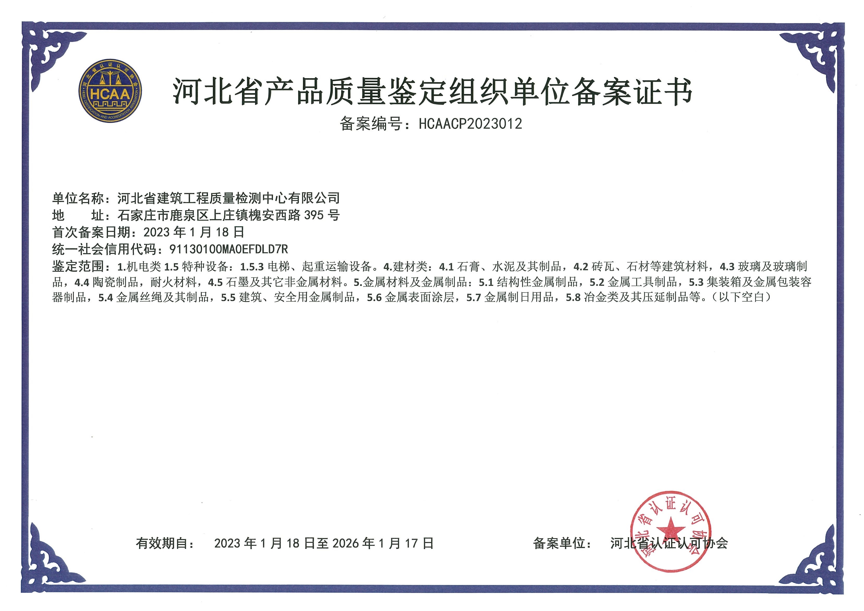 河北省建筑工程質(zhì)量檢測中心產(chǎn)品質(zhì)量鑒定組織單位備案證書1